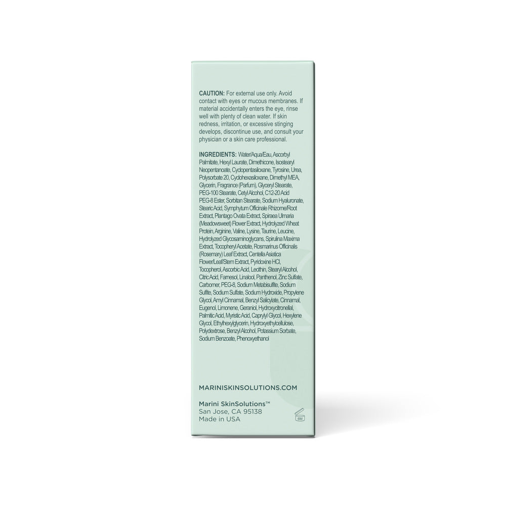 Water/Aqua/Eau, Ascorbyl Palmitate, Hexyl Laurate, Dimethicone, Isostearyl Neopentanoate, Cyclopentasiloxane, Tyrosine, Urea, Polysorbate 20, Cyclohexasiloxane, Dimethyl MEA, Glycerin, Fragrance (Parfum), Glyceryl Stearate, PEG-100 Stearate, Cetyl Alcohol, C12-20 Acid PEG-8 Ester, Sorbitan Stearate, Sodium Hyaluronate, Stearic Acid, Symphytum Officinale Rhizome/Root Extract, Plantago Ovata Extract, Spiraea Ulmaria (Meadowsweet) Flower Extract, Hydrolyzed Wheat Protein, Arginine, Valine, Lysine, Taurine, Leucine, Hydrolyzed Glycosaminoglycans, Spirulina Maxima Extract, Tocopheryl Acetate, Rosmarinus Officinalis (Rosemary) Leaf Extract, Centella Asiatica Flower/Leaf/Stem Extract, Pyridoxine HCl, Tocopherol, Ascorbic Acid, Lecithin, Stearyl Alcohol, Citric Acid, Farnesol, Linalool, Panthenol, Zinc Sulfate, Carbomer, PEG-8, Sodium Metabisulfite, Sodium Sulfite, Sodium Sulfate, Sodium Hydroxide, Propylene Glycol, Amyl Cinnamal, Benzyl Salicylate, Cinnamal, Eugenol, Limonene, Geraniol, Hydroxycitronellal, Palmitic Acid, Myristic Acid, Caprylyl Glycol, Hexylene Glycol, Ethylhexylglycerin, Hydroxyethylcellulose, Polydextrose, Benzyl Alcohol, Potassium Sorbate, Sodium Benzoate, Phenoxyethanol